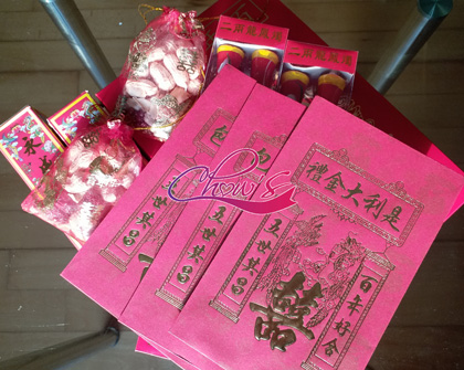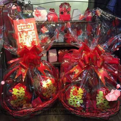 - 10. 百年好盒:放有糠果、紅棗、花生、桂圓、蓮子、百合、扁柏、青縷兩對、紅頭繩、利是、及首飾